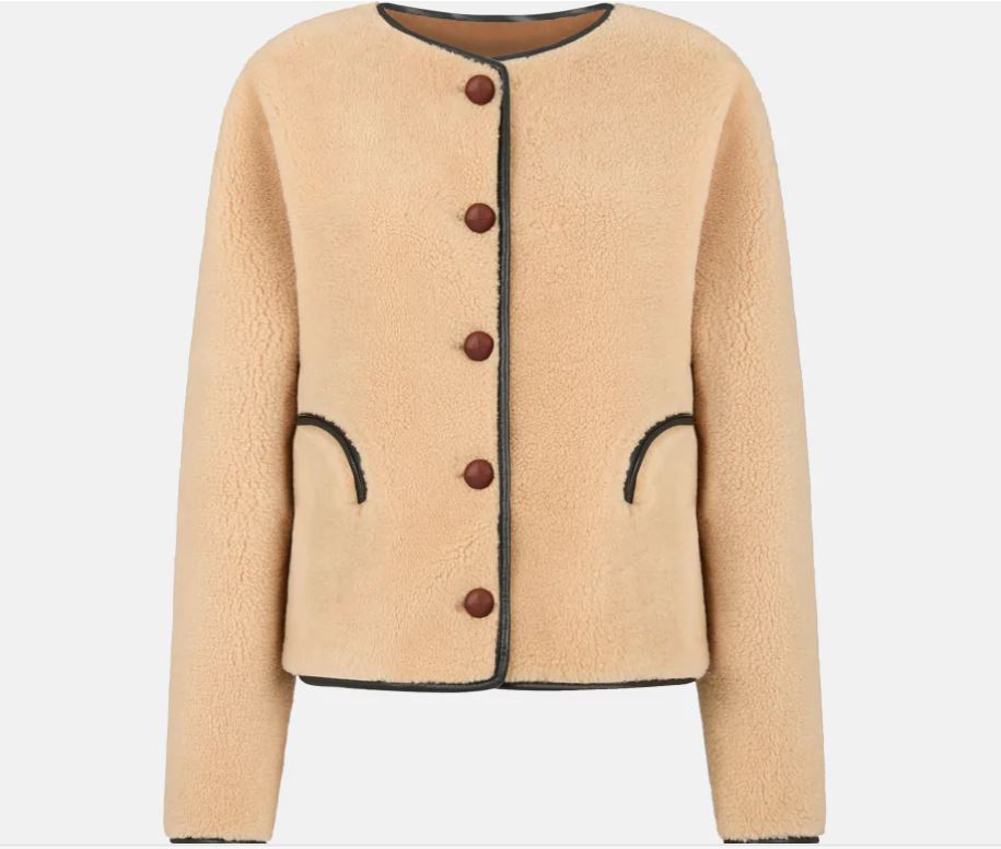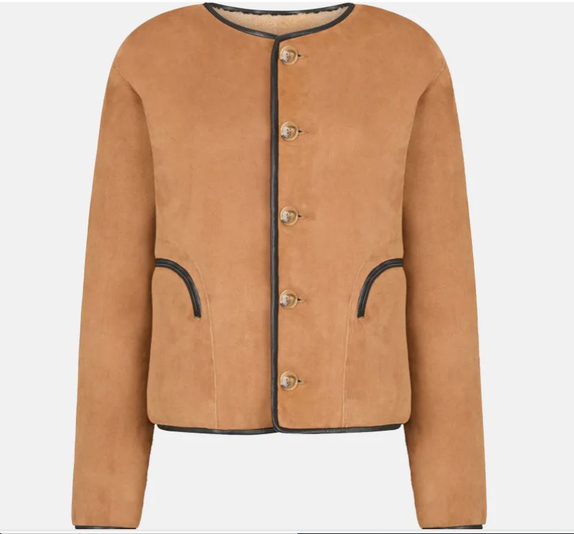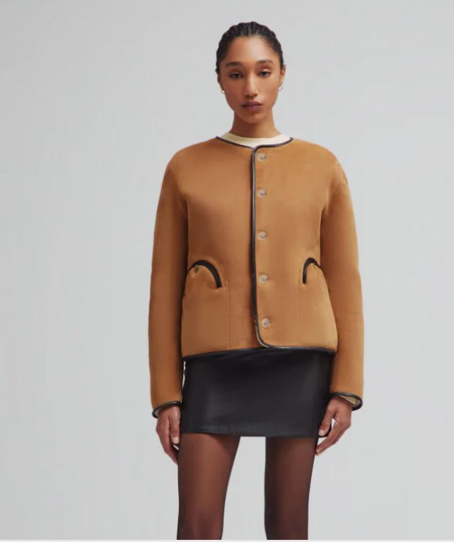 A hip-length, collarless shearling bolero with a row of buttons and Smiley pockets. A BLAZÉ Milano classic, now in rich brown suede with leather trim. Tortoiseshell-effect buttons complete the look.